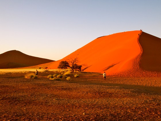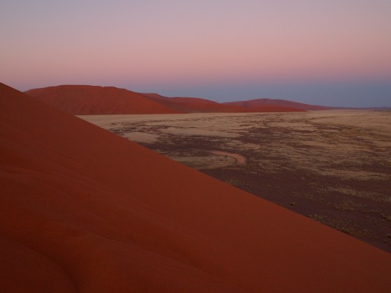 My G Adventures African Overland Truck group got up at 4:30am, dressed quickly and drove 15 minutes from our campsite to Dune 45 in Namibia, Africa. I was filled with anticipation to finally see this beautiful and awe-inspiring sand dune and to hike up the spine of it! We were the first group to arrive and began running up single file in the dark to witness the sun rising. Having sand boarded in the Peruvian desert, I was under the wrong impression that you could fall off the side, tumble-down and hurt yourself The sand felt very soft and dense under my bare feet and as I climbed higher and higher, I began to get scared. This sand dune is immense! I finally stopped, sat down and let others pass me by. I’ve jumped out of an airplane, but climbing to the top of this mammoth sand dune before the sun was up was too scary for me. I pride myself on not being scared of much in life, but decided I didn’t have anything to prove. I sat on the spine of Dune 45, watching the sunrise and trying to capture the moments with my camera.