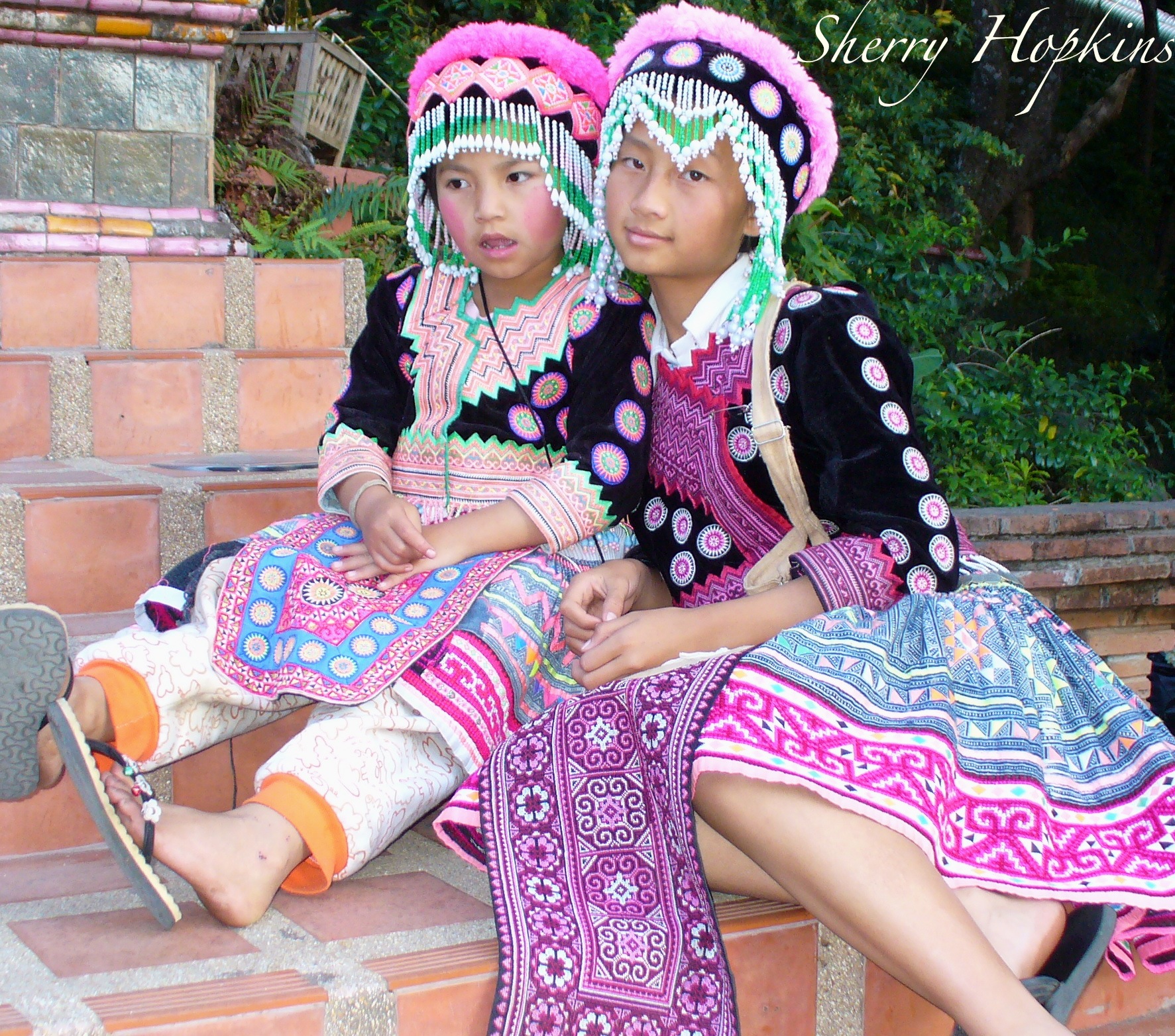 Wonderful Photos! A few comments if I may without stepping on anyone’s toes. Thailand is my second home. I lived there for 12 years and was a tour guide for three. I also lived with the Lisu, Meo and Black Lahu tribes for quite some time. I’ll be retiring there as an organic farmer in three more years. I’m far from an expert but thought I’d toss in my two cents worth. Photos are probably closer to Chiang Rai. First photo are Meo (possibly Mung) children. Most of the hill tribes don’t really have a Nationality…long political story. They aren’t actually wearing “costumes”, it is their regular clothing though this may be their “let’s meet the tourist and make a few baht” Sunday best. The girls start the embroidery when they are about 4 years old – each tribe has their own design. A lot of the work is done without printed patterns – freehand. The boys drum is big but not heavy. The next photo – oh so sweet – also look Meo but possibly Karen or Kunming refugees…they all blend together for many reasons. The girls with the umbrellas and fancy head dress – definitely dressed to make money on photos from tourist….please remember your probably camera costs more than their family makes in a year, so a bit of snobbery is to be expected as this is actually one way they make money…beats prostitution. Think of famous movie stars passing by your house everyday and going ” Oh Look. A cute little housewife doing laundry. Quick, take a picture to show our friends”. Your tongue might stick out after awhile too. Some of the tribes do quite well..others still struggle. The school photo makes me want to go back. I taught English for 4 years there. So many great memories. The kids with the Lotus flowers – Lord I’m getting homesick. And don’t get me started on Thai dogs!! Especially the hill tribes. Your photos are amazing. I now have to go scan my old ‘photo albums’ for an hour or two and dream!! Love it!
