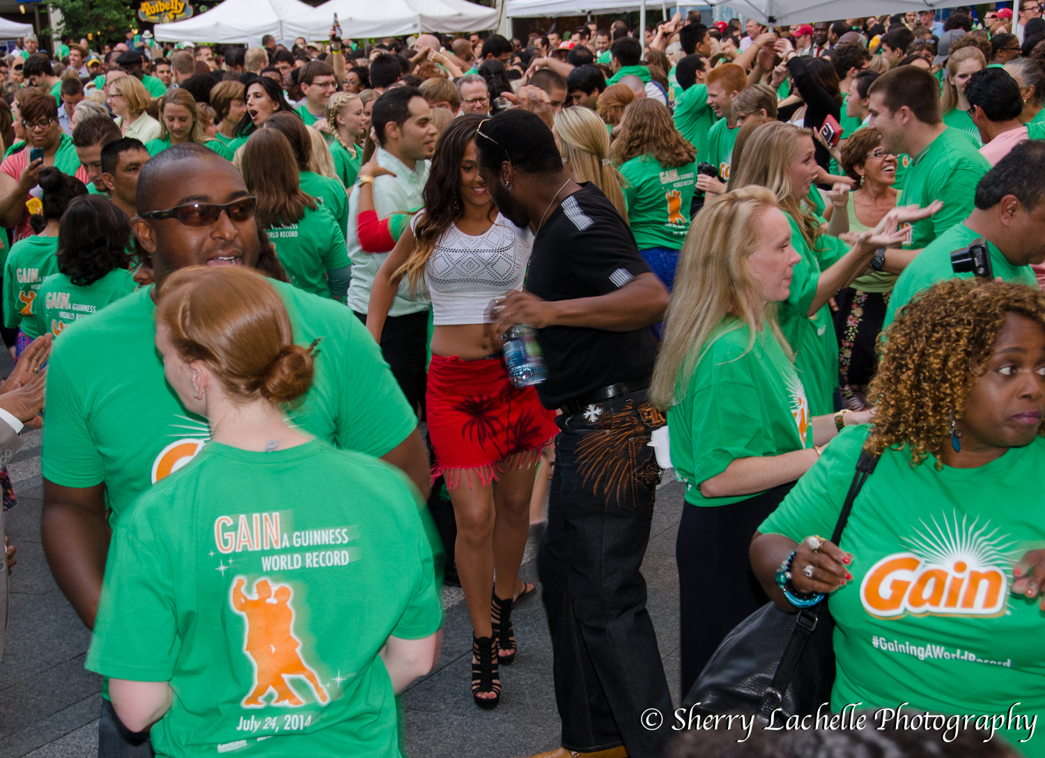 Thursday evening, July 24, 2014 is a day to go down in the record books, specifically the Guinness World Records book, for the City of Cincinnati to beat Mexico’s past record of the largest Salsa dance, with over 2,000 people moving to the rhythm!  I was there to capture the excitement and energy for iSPYCINCY taking photographs of the event.  Green “Gain” shirts were given out to the attendees, as you can see in the photo…