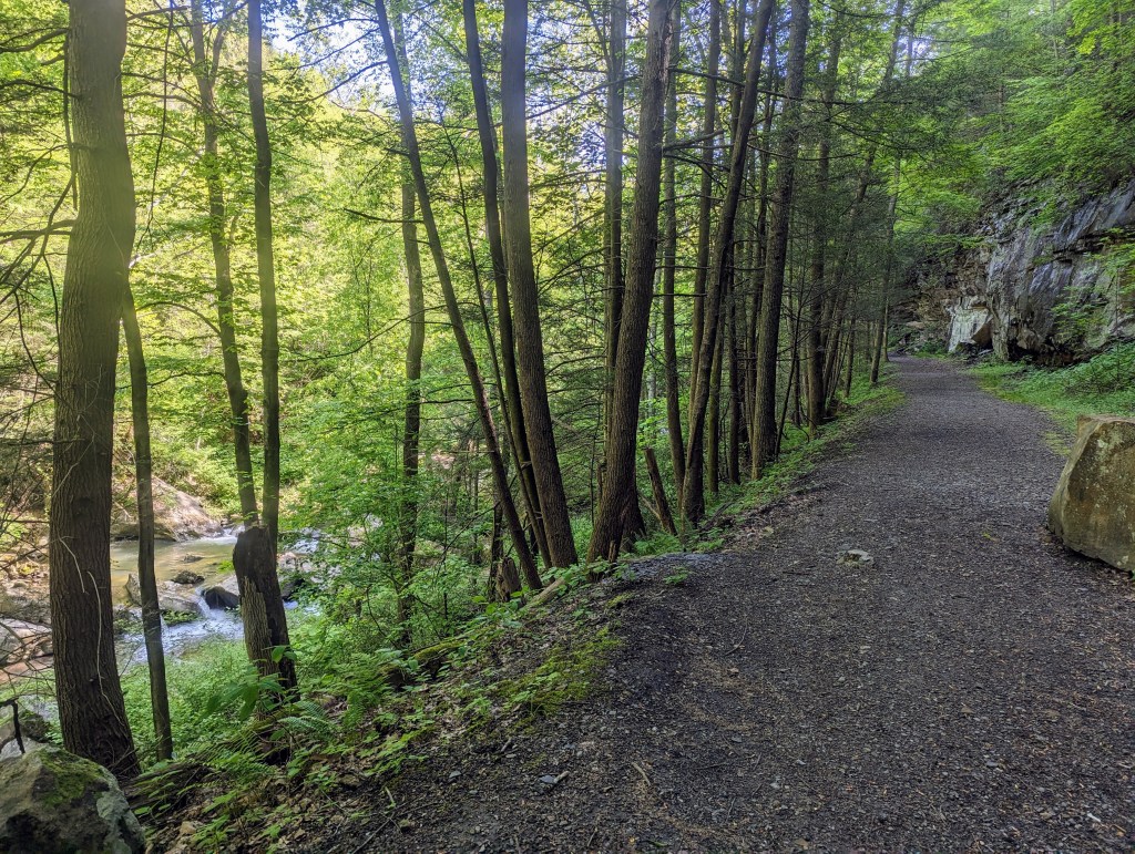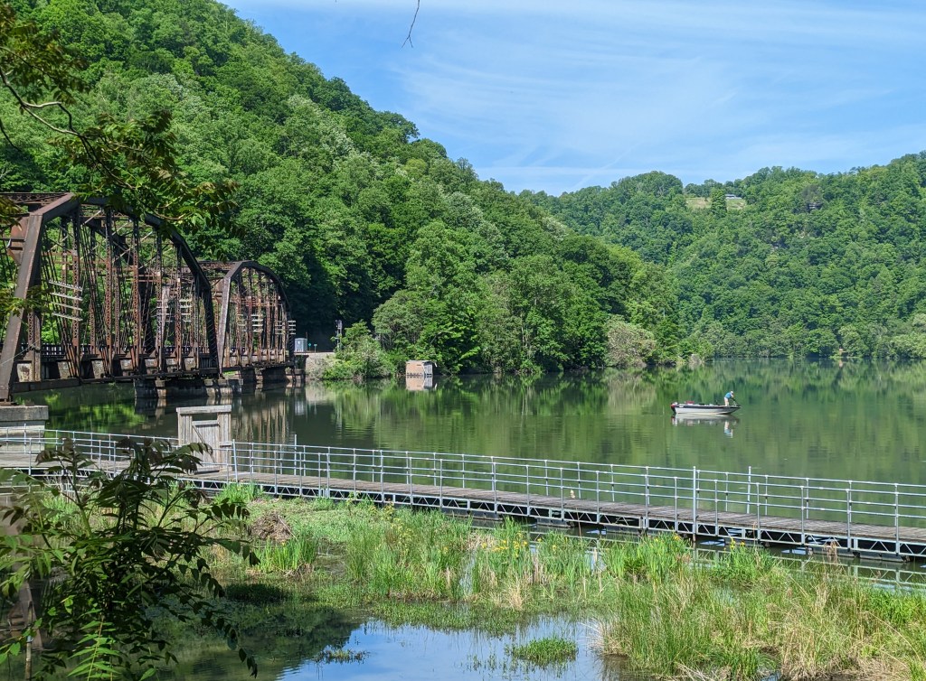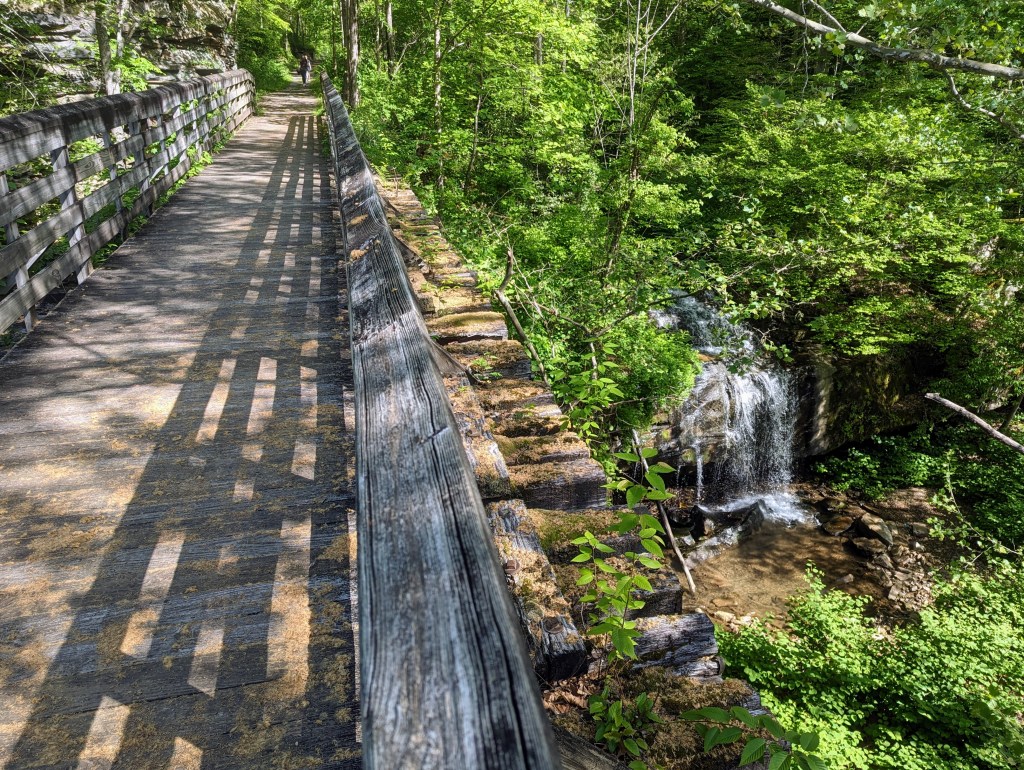 On our final day of the road trip, we hiked almost 4 mi on the Hawk’s Nest rail trail. It was a lovely mostly flat trail alongside a creek that had lots of waterfalls. At the turnaround point there was a pretty lake and train trestle.