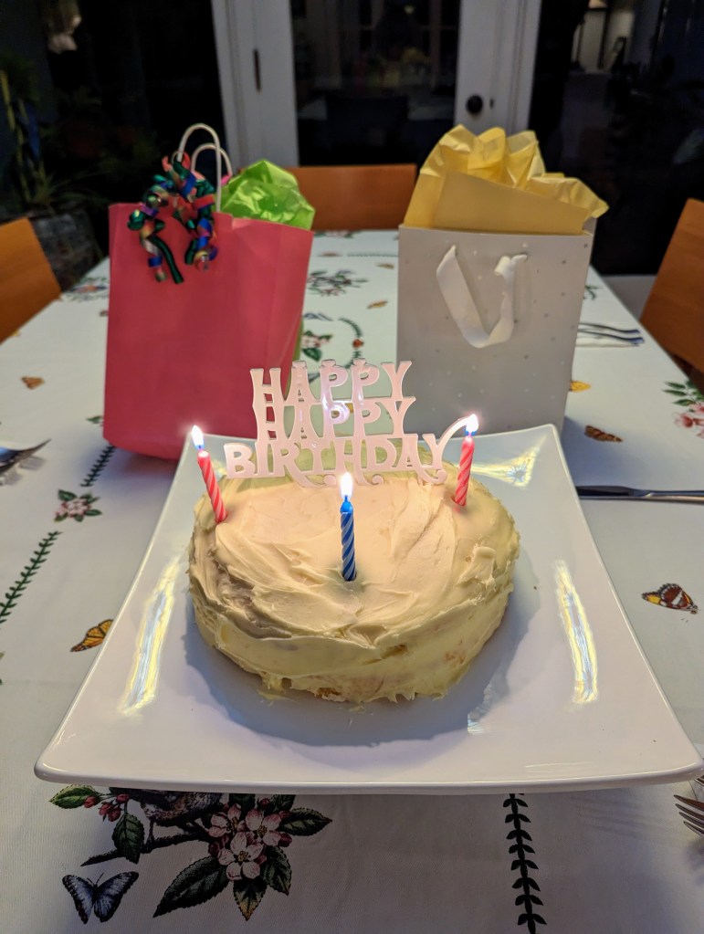 This past Sunday my brother and his wife had me over for an early birthday celebration. He’s a good cook, and made a shrimp/ asparagus risotto that was yummy. He also baked a lemon cake, which was very sweet of him.