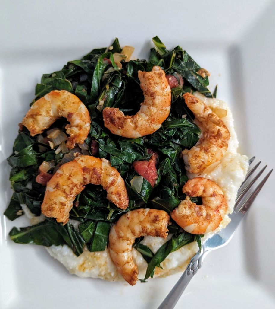 And last night I made a new recipe called Collards & shrimp with cheesy grits. It was tasty!