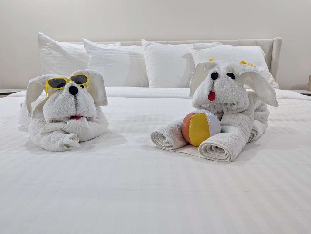 My little room has a kitchenette. The towel art was cute…