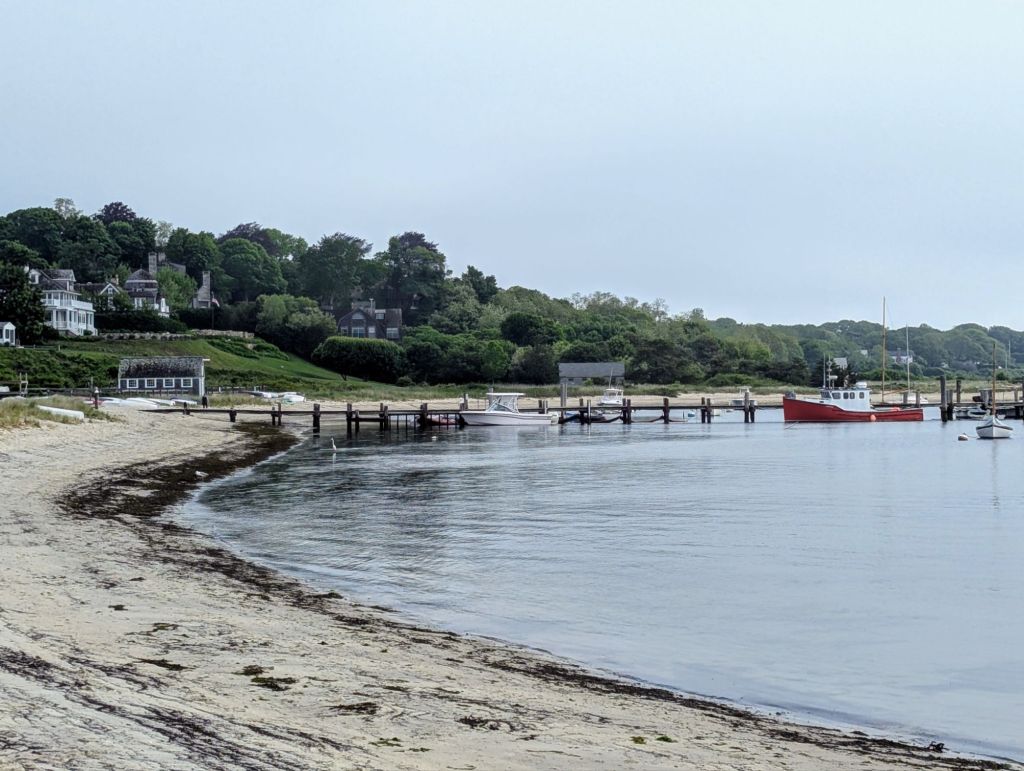 Yesterday, I took the 7:15am – 45 minute ferry from Woods Hole Terminal, Falmouth, MA to Vineyard Haven, Martha’s Vineyard. I had reserved an E-Bike, but canceled it a week ago because their cancellation policy would only refund 50% if the weather was bad. There was a Hertz rental car agency just off the ferry, so they gave me a much better rate than online. The weather was foggy and chilly, but at least it wasn’t rainy. I drove along Beach Road and took a pic.