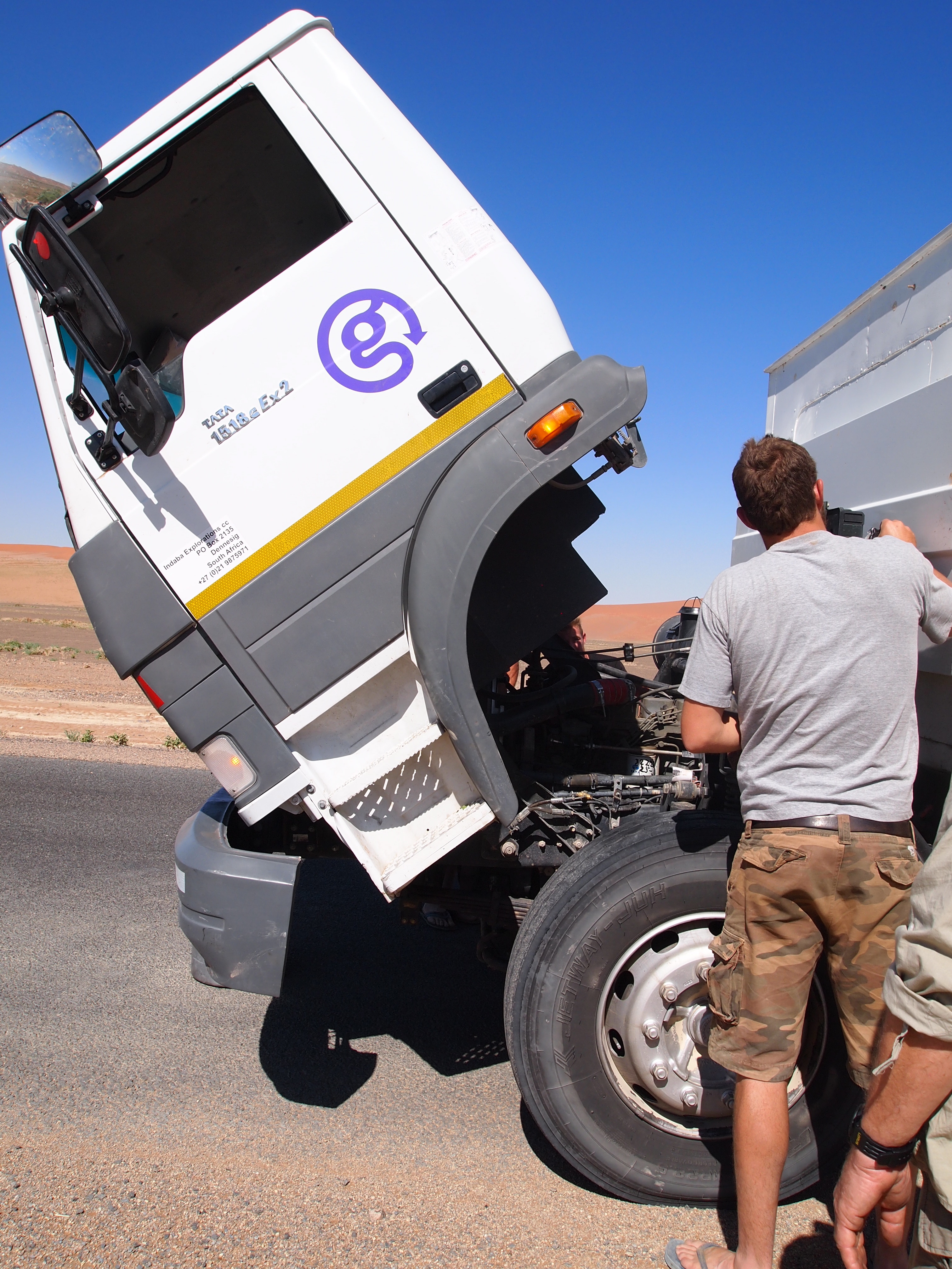 Originally, we were supposed to have a different truck, but the first morning of the trip, as they were beginning to load the truck with luggage, someone drove by and ripped the doors off of the truck! I took a photo of the road and truck for most of them.