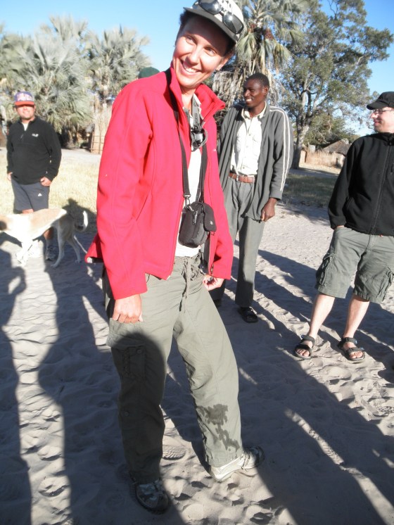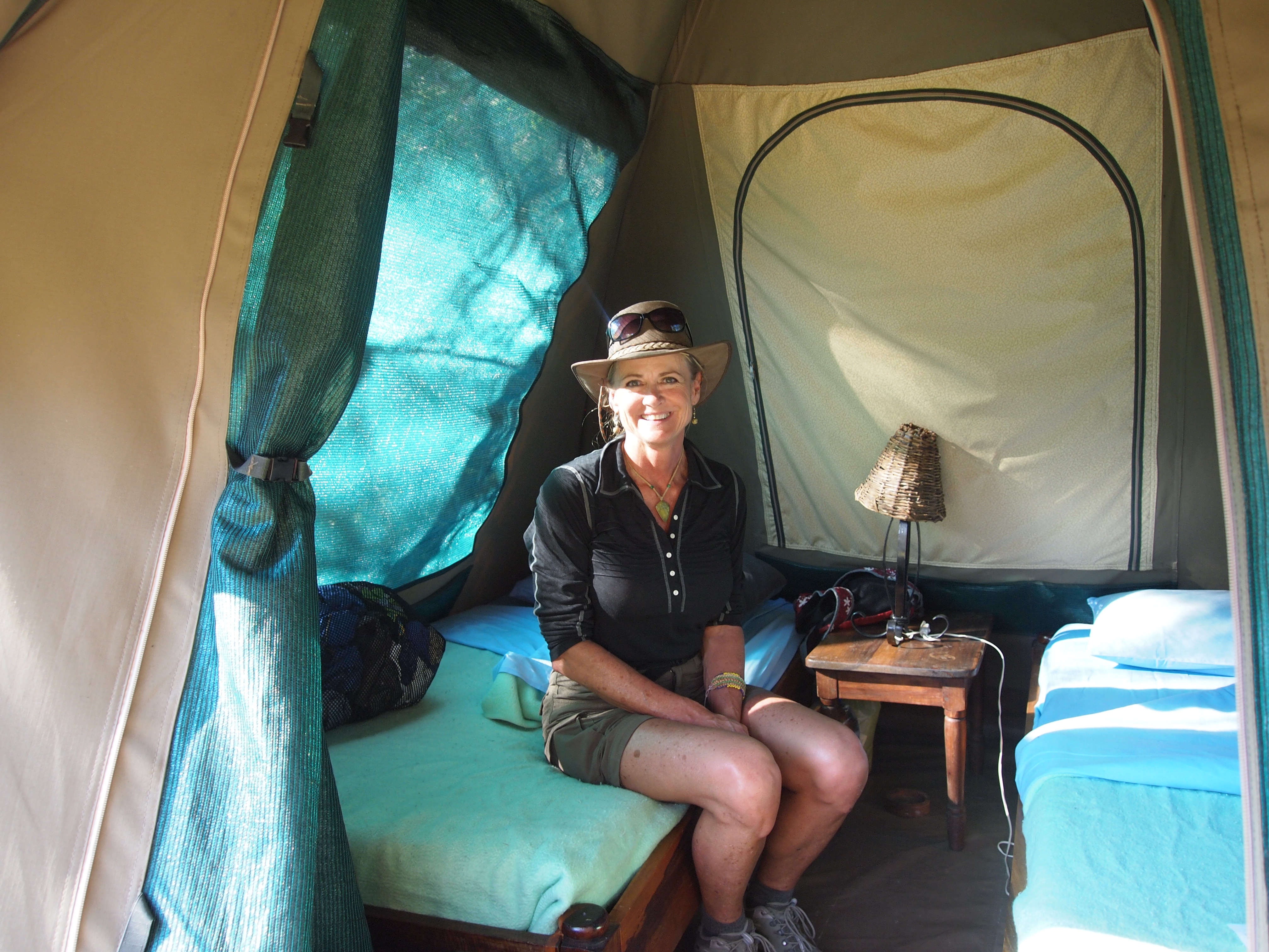 Today, we drove four hours from Chobe National Park in Botswana to Livingstone, Zambia, where the mighty Victoria Falls are. After crossing the border into Zambia, we arrived at the Zambezi Waterfront Campsite, where we would stay put for four nights (a welcome change after moving almost every day). I paid $10 to upgrade to a tent with electricity and a bed (see below)! And for the first time on the trip shared my space with someone (lovely Kelly from Australia) for two evenings! Here’s a photo of her in Botswana after a dog went wee wee on her leg…