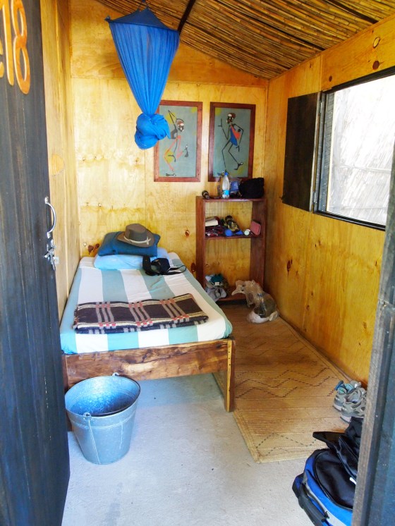 We arrived at the Kisolanza Restcamp, nicknamed the “Old Farmhouse” at 5:30pm. Because we were leaving in the morning by 5am, I decided to upgrade one last time to a room. It was in an old horse stall (that had been renovated) and cost $30. That’s one of the downsides of traveling solo – you don’t have someone to split the cost with (but there are plenty of upsides). There was a down comforter on the bed..oouu…ahh! And fresh flowers! Here’s the room…