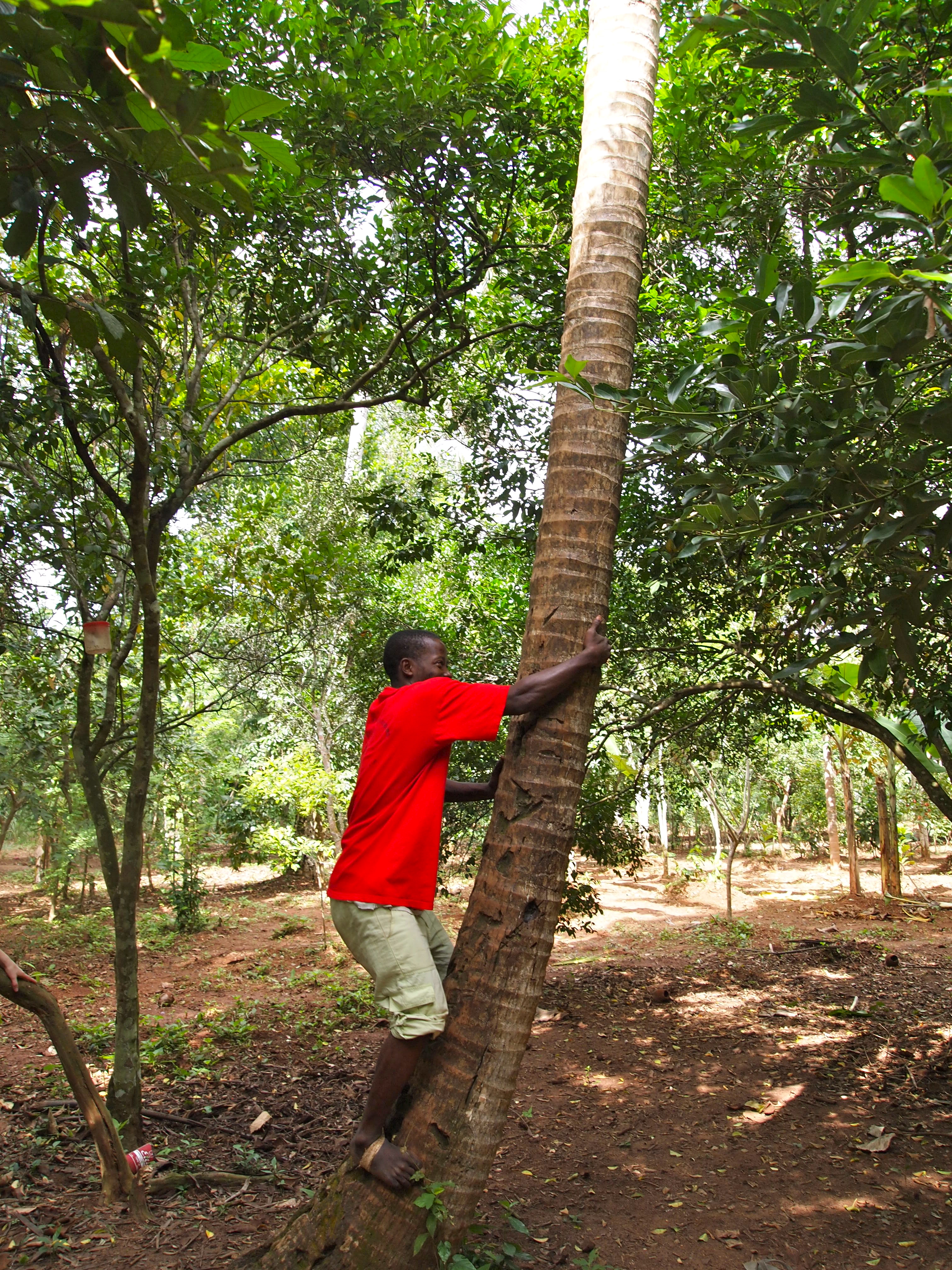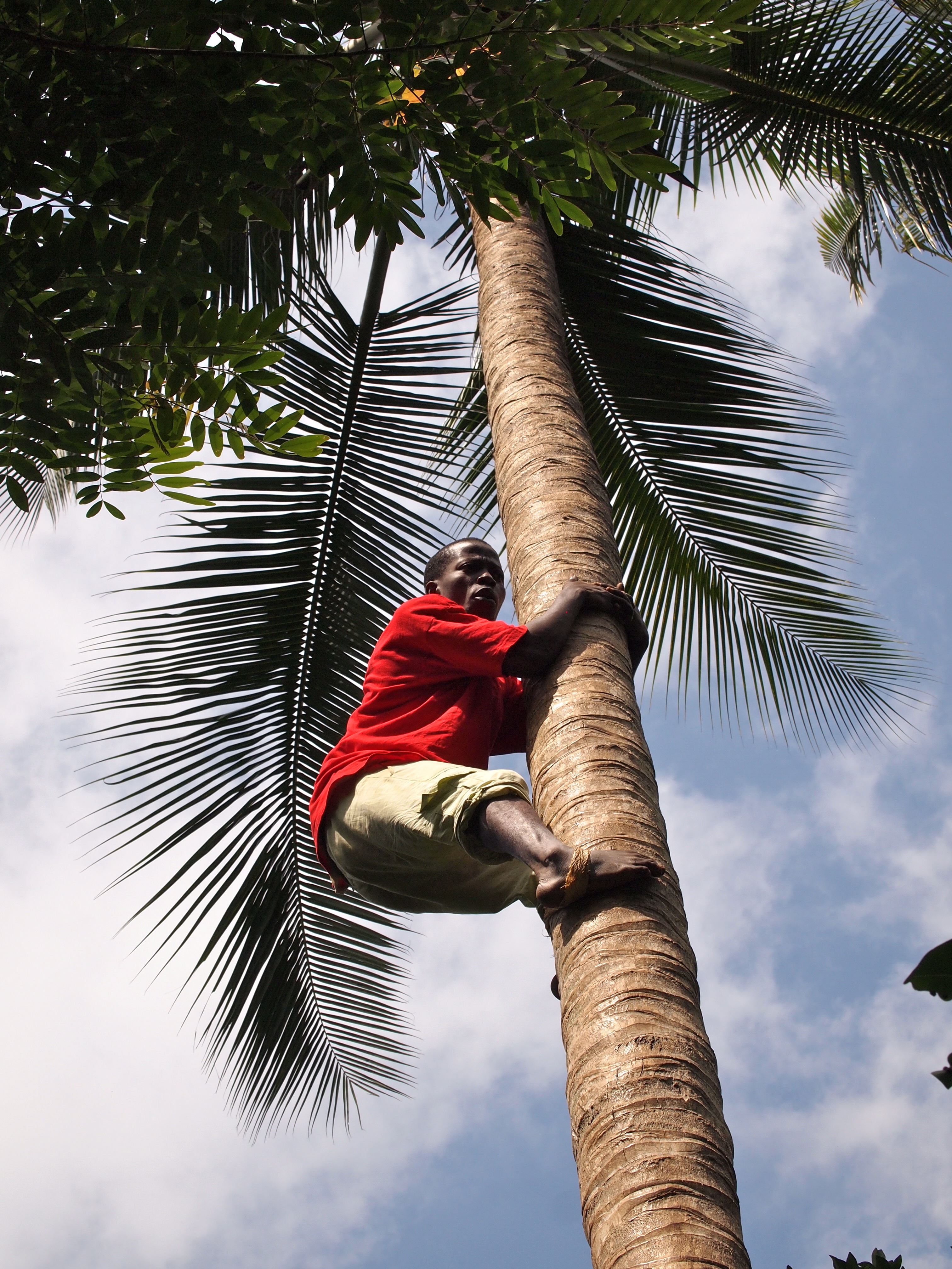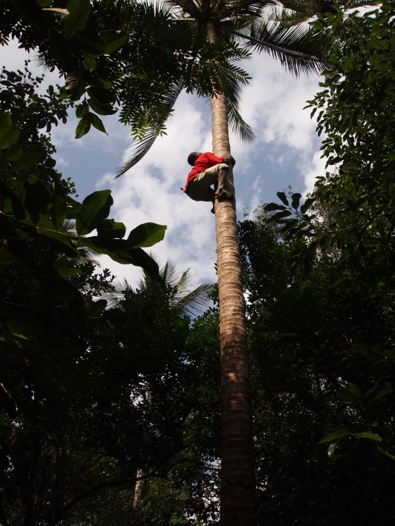 This guy wrapped some type of strong leaf in a figure 8 around his feet, jumped up on the tree and began leaping like a frog up the tree! He was singing the entire time and made it to the top!