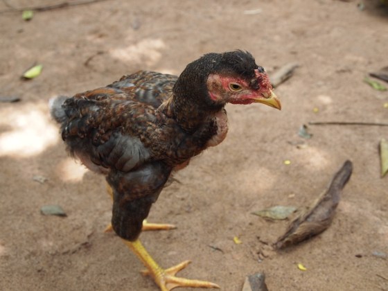 The chickens were fighting over the coconut droppings. This chicken was strange looking!