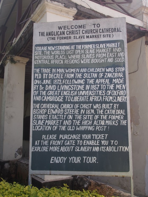 The tour lasted about 20 minutes. First we walked through the church and he explained that since slavery had been abolished in the States in 1863 and it wasn’t abolished in Zanzibar until 1873, for those 10 years, the slaves were shipped to other countries other than the U.S., such as Dubai and other Middle Eastern countries. While researching for this post, I found information that is contrary to what my tour guide gave. Actually, slavery wasn’t completely abolished in the U.S. until 1865 and in Zanzibar until 1897. There was a treaty signed with Britain to suppress slavery in Zanzibar in 1873.