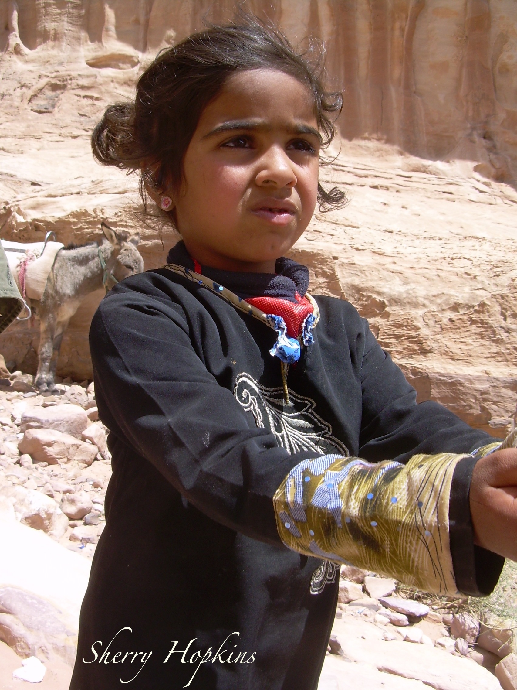 While hiking through Petra, Jordan, we encountered this beautiful little girl. I don’t remember if she was selling something or just begging, but I was entranced!