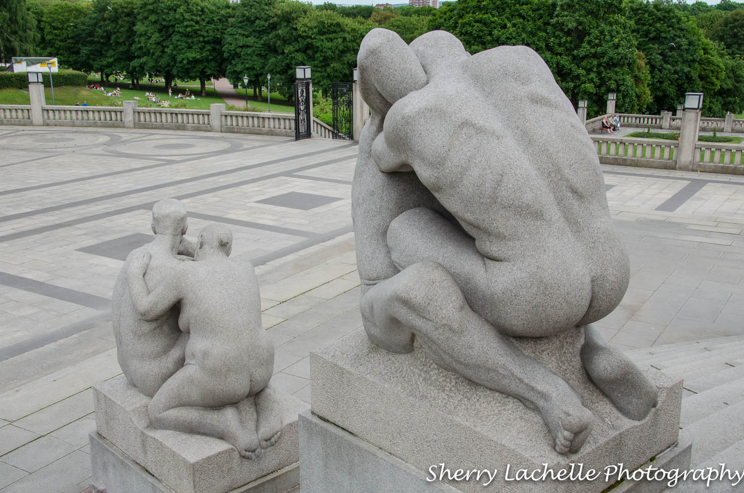 The next stop on my travel agenda was Frogner Park in Oslo, Norway to see the whimsical statues created by Gustav Vigeland I’d read about! It was exactly the kind of place I envisioned with broad spans of green lawn, a beautiful fountain, and quirky statues! Frogner Park is one of the most popular tourist attractions in Norway with 1 to 2 million visitors per year. It’s the World’s largest sculpture park made by a single artist. I endeavored to capture photos without “real” people in them, but it was challenging…
