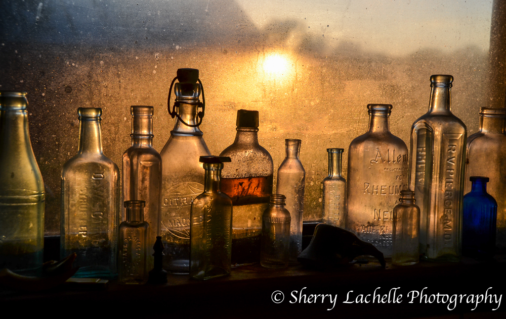 I arrived to my Cousin Steve’s farm late on Tuesday evening after spending the afternoon exploring the gorgeous Amish countryside in Holmes County, Ohio. His farm is in Mt. Vernon, Ohio, almost 1 1/2 hrs. Southwest of Holmes County, on the way back to Cincinnati. I’ve only visited once before, a few years ago, so I was looking forward to it! As we brought my overnight bag into his home, the setting sun caught my eye, glowing gold behind bottles on his kitchen windowsill…