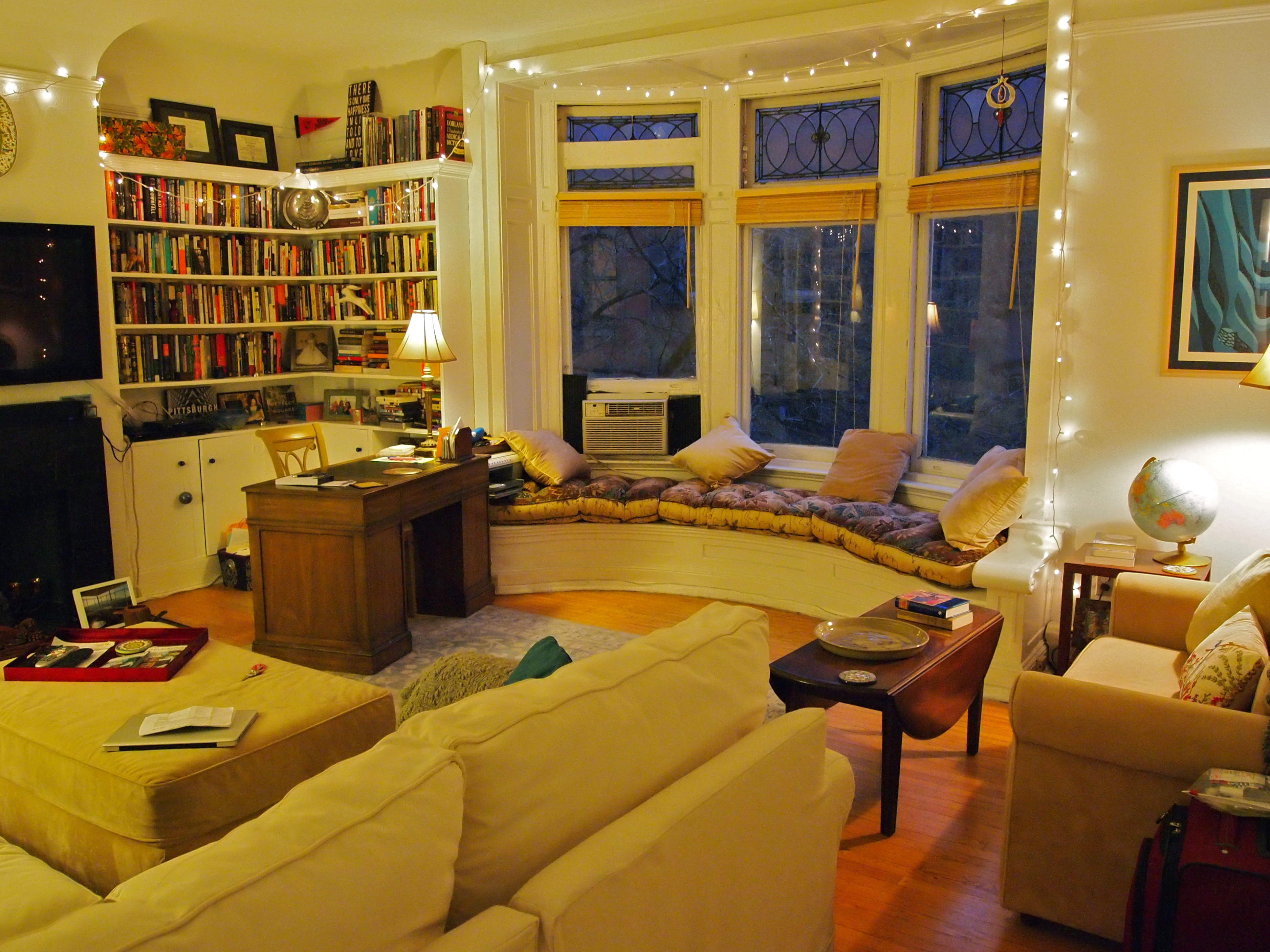 This is her living room. I love window seats! She is a voracious reader and just outside of this photo on the left is another built-in bookcase with books!