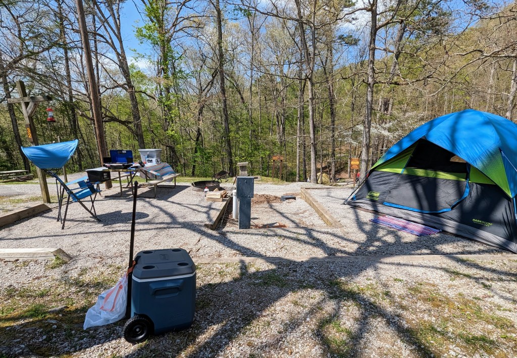 I returned yesterday from a two night solo camping trip. I camped at Cumberland Falls State Resort Park in Kentucky. There was one other couple tent camping, they were very nice and helped me put the rain fly on my tent. I haven’t camped in 10 years and I haven’t solo camped for 16 years. I forgot how much work is involved. It was beautiful weather, it did get down to 46° the first night, but I slept better there than I did at home. I hiked 3 trails in 2 days, for a total of 11 mi. Cumberland Falls is called the Niagara of the South.